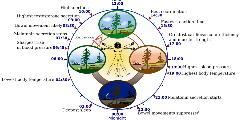 Ljudski se organizam ravna prema bioritmu od 24 sata koji je usklađen s pojavom dana i noći. Taj se ritam se zove cirkadijski ritam i osim u ljudi primijećen je kod biljaka, životinja, gljiva i cijanobakterija. Cirkadijski je ritam ugrađen u nas te se on donekle prilagođava čimbenicima u okolišu od kojih je najvažnija pojava dnevnog svjetla. Osoba koja se budi oko 7 h ujutro ima najbolju budnost oko 10 h, njeno vrijeme reakcije je najkraće oko 15 h, fizička sprema je na vrhuncu oko 17 h, a najviši tlak i tjelesnu temperaturu imaju oko 19 h. Negdje oko 21 h započinje priprema za san jer tada kreće lučenje hormona melatonina. Oko 2 h noću smo u najdubljem snu, oko 4 h ujutro imamo najnižu tjelesnu temperaturu, a oko 7 h počinje naše buđenje i kraj lučenja melatonina. Ove vrijednosti su okvirne, one se razlikuju od pojedinca do pojedinca i vrijede u slučaju kada cirkadijski ritam nije poremećen umjetnim svjetlom. Unatoč određenoj fleksibilnosti u cirkadijskom ritmu, on kod ljudi ne može biti kraći od 23.5 ili duži od 24.6 sata bez štetnog utjecaja na zdravlje.